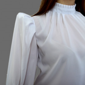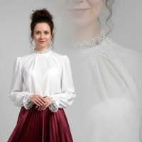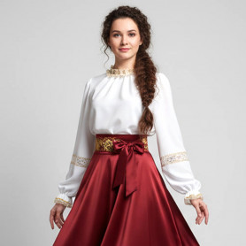 Костюм выполнен из габардина и красиво подобранного декора в золотистых цветах. Достоинства габардина в том, что он не мнется, не блестит, как атлас, ложится красивыми мягкими складками, цвет не выгорает. Юбка с оборкой, декор в золотистых цветах, по талии на двойной резинке. Блуза белого праздничного цвета, с баской, рукава расширены внизу, с манжетами. Сзади на блузе шнуровка. Она дает хорошую посадку по фигуре. Костюм предназначен для творческих сольных и коллективных театральных выступлений.