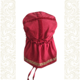 Для кокошника подобраны качественная парча благородного приглушенного золотого цвете, вологодское кружево, стеклянные, стразы рубинового цвета, бусины искусственного жемчуга.