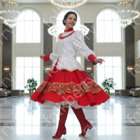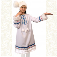 Костюм выполнен из парчи бело-серебристого цвета. Костюм декорирован искусственным мехом белого цвета. Застежка - потайные кнопки. Силуэт - приталенный, сзади кулиска для регулировки талии. Красивый пышный рукав. Отделка - серебристая ажурная тесьма. Длина шубки по спинке 93-98 см (от седьмого шейного позвонка до низа изделия).