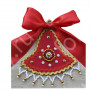 Накосник выполнен из атласа и украшен ажурной тесьмой, стразами и бусинами.