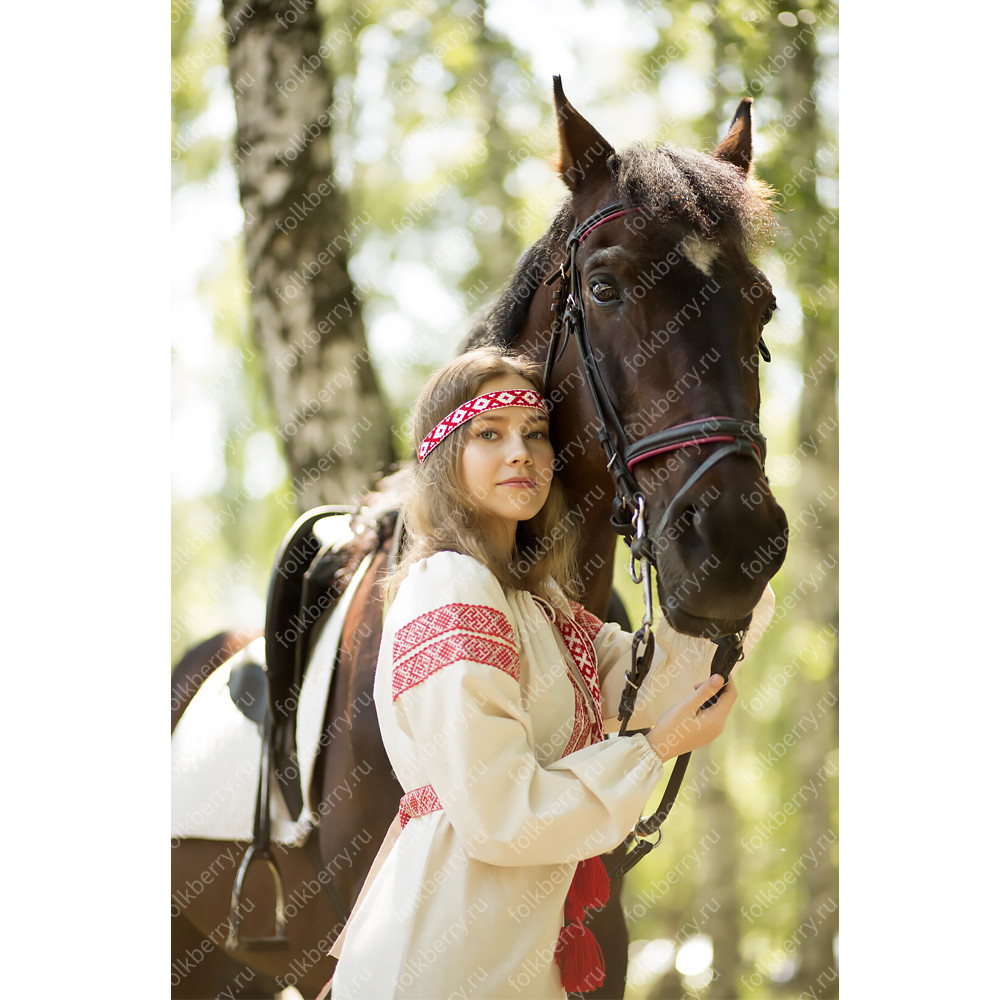 Платье смотрится очень интересно: спокойный фон белого или небеленого натурального льна, рисунки-символы красного ( синего, зеленого) цвета создают удивительный образ в фольклорном духе.