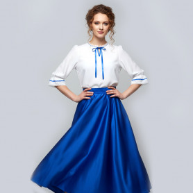 Юбка сшита из габардина, украшена тесьмой из жаккарда, а также кружевом и тесьмой «вьюнок».
