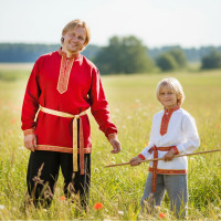 Русская народная рубаха (косоворотка) с кушаком. Изготовлена из хлопка, декорирована жаккардовой тесьмой. Яркий узнаваемый во всем мире рисунок "хохлома" и насыщенные цвета делают Косоворотку праздничной.