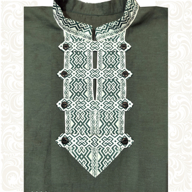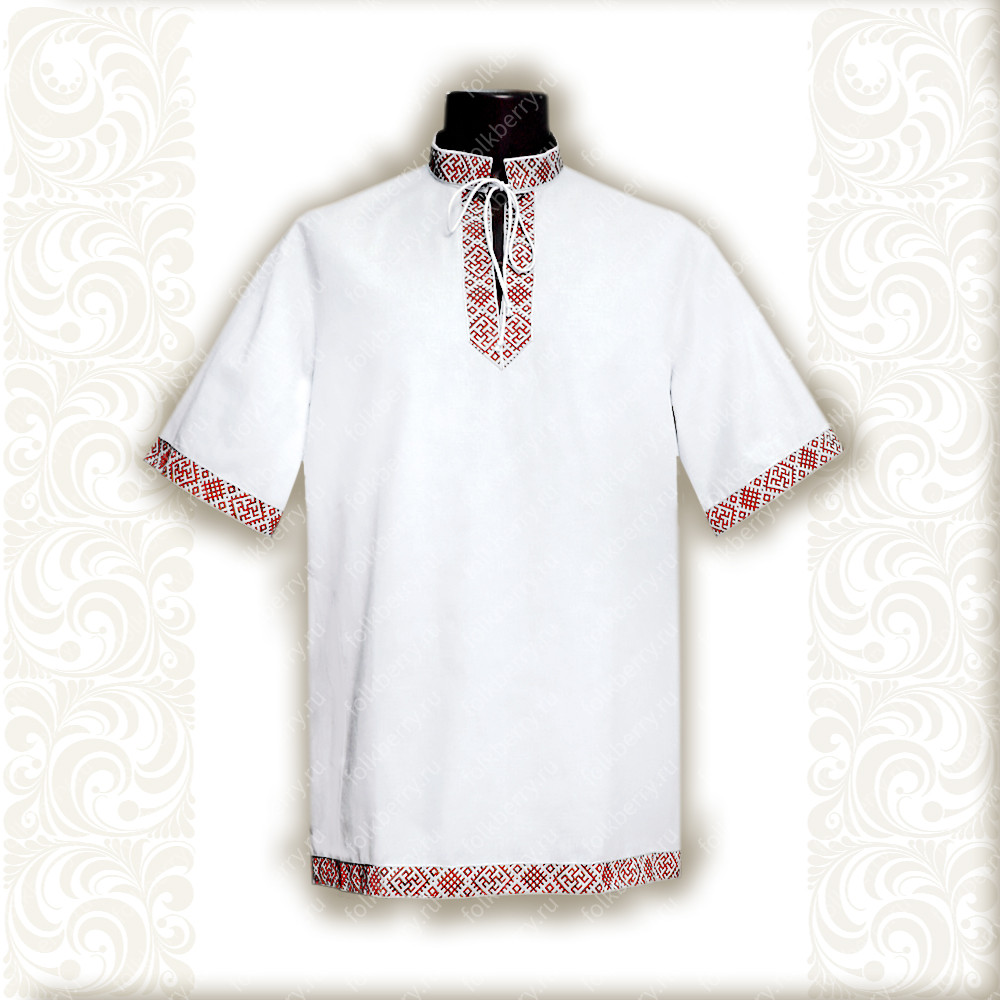 Рубаха мужская «Истоки» с коротким, втачным рукавом выполнена из белого льна. Ворот, рукава, низ изделия оснащены декором из жаккардовой тесьмы с традиционными славянскими обережными узорами. Модель комплектуется поясом (кушаком) из ткани с тесьмой.