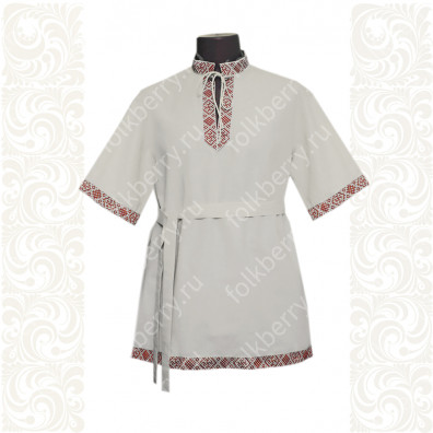 Рубаха мужская «Истоки» имеет свободный крой, выполнена из льняной ткани, имеет короткий, втачной рукав. Жаккардовая тесьма с обережным рисунком обрамляет ворот, рукава, низ изделия. В комплект входит выполненный из ткани с тесьмой пояс (кушак).