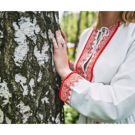 Декор по мотивам рисунков знаменитого художника 19 века Ивана Билибина. Цвет сарафана - насыщенный благородный красный, перекликается с цветом декора.