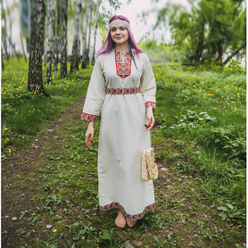 В комплект входит очелье  пояс с кисточками, выполненные в технике ткачества.