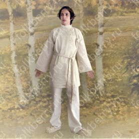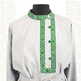 В комплекте с сарафаном идет белая блуза. По индивидуальному заказу она может быть сделана либо из хлопка, из шифона, либо из атласа. Блуза имеет пышные длинные рукава с резинками на запястьях и украшением в виде жаккардовой тесьмы.