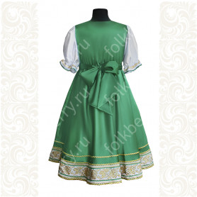 Сарафан с блузой «Глаша» выполнен из небеленного льна в традиционном славянском стиле. Модель отличается свободным кроем, украшена красной жаккардовой тесьмой с цветочным рисунком, золотистой тесьмой и «вьюнком». Бретели сарафана регулируются по длине. Комбинированная блуза из хлопка со вставками из льна с длинным рукавом украшена таким же, как и сарафан, орнаментом.