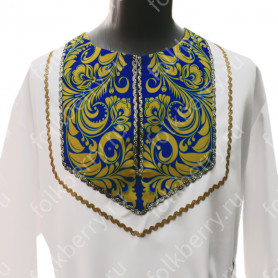 Белая праздничная блуза из хлопка имеет пышный рукав и украшена такой же тесьмой, что и сарафан.