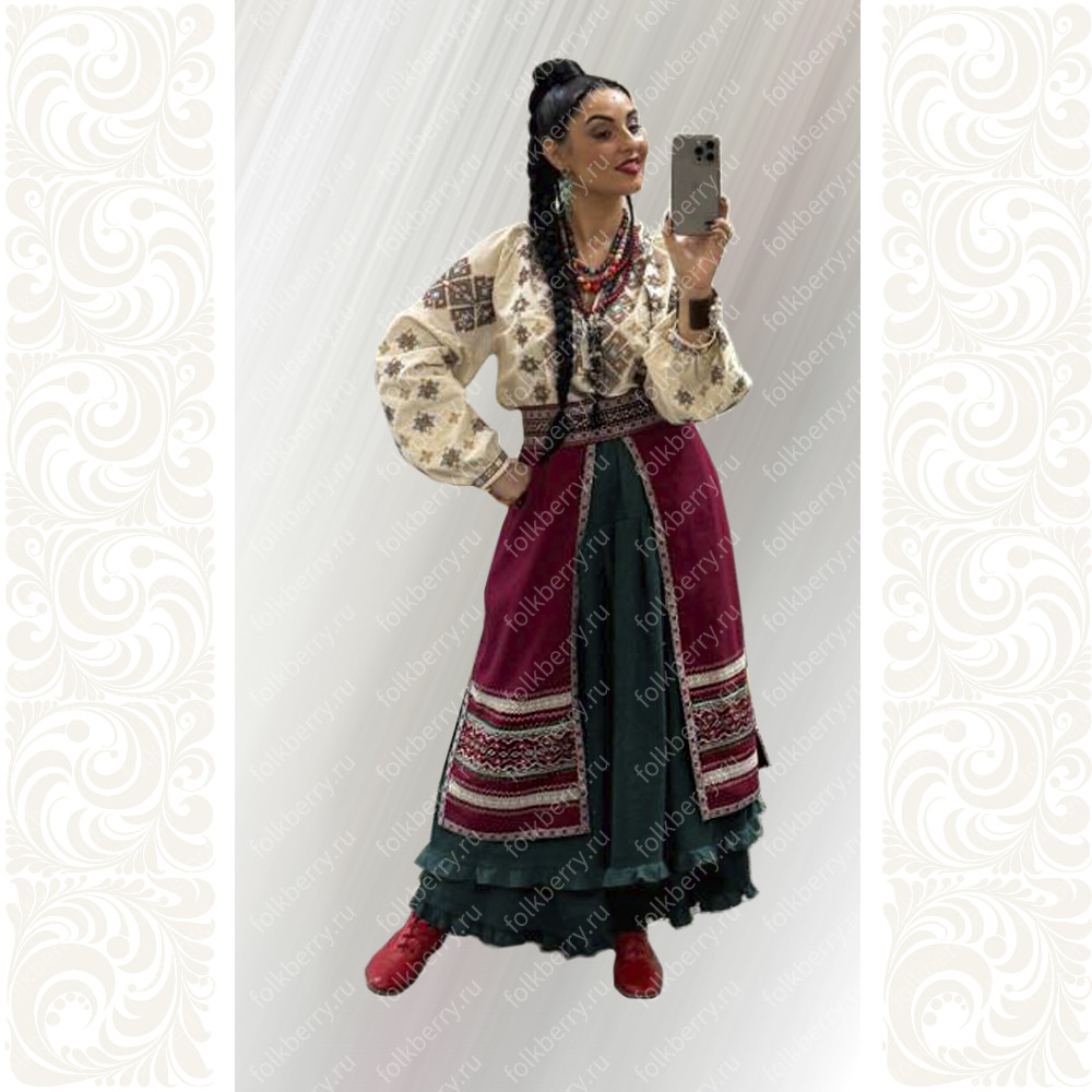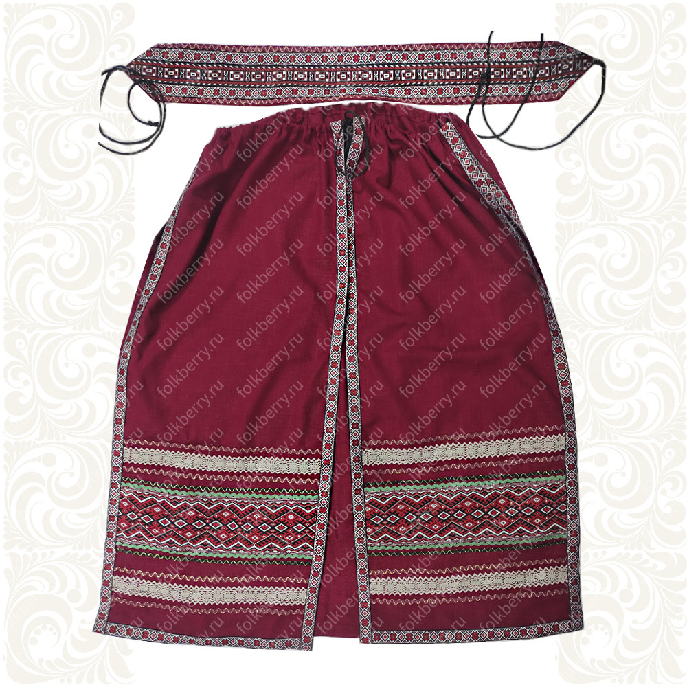 Характерное отличие поневы от любой другой юбки в том, что она обычно изготавливается из трех кусков ткани прямоугольной формы, собранных на общем поясе. Понева выполнена изо льна черного цвета. Каждая часть поневы декорирована жаккардовой тесьмой и вьюнами внизу и по примеру. Примечательно, что широкая тесьма с цветочным узором, выполнена на основе исторического изображения, см. фото. Как правило, поневу надевают на длинную рубаху и подпоясывают тканым славянским поясом или поясом-шнурком.