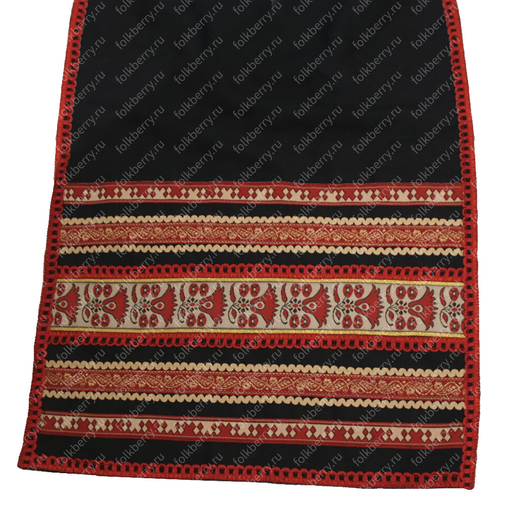 Характерное отличие поневы от любой другой юбки в том, что она обычно изготавливается из трех кусков ткани прямоугольной формы, собранных на общем поясе. Понева выполнена изо льна черного цвета. Каждая часть поневы декорирована жаккардовой тесьмой и вьюнами внизу и по примеру. Примечательно, что широкая тесьма с цветочным узором, выполнена на основе исторического изображения, см. фото. Как правило, поневу надевают на длинную рубаху и подпоясывают тканым славянским поясом или поясом-шнурком.