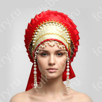3. Кокошник выполнен из парчи, кружева, страз. К кокошнику прилагаются полупрозрачная фата и длинные бусы-подвески. Высота кокошника 13 см. Сзади ленты-крылья. Кокошник легкий и удобный.